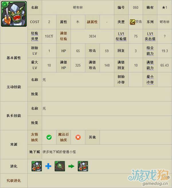 哥布林是木属性的宠物,主动技能无,队长技能同样无,更详细的资料请看下面的介绍。
