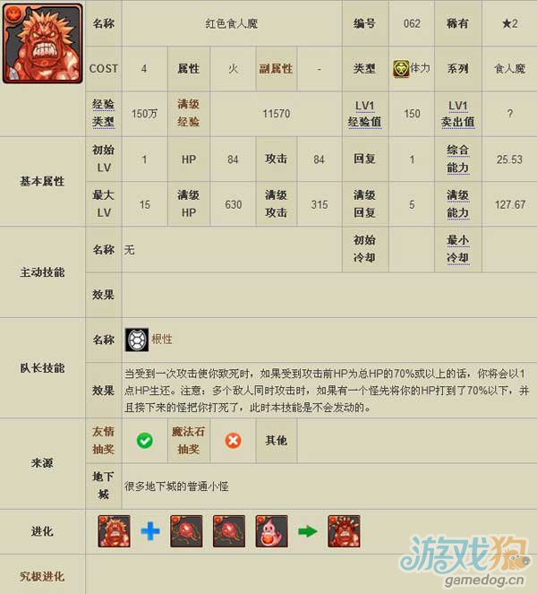 红色食人魔是火属性的宠物,主动技能无,队长技能为根性,更详细的资料请看下面的介绍。