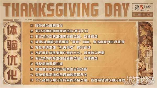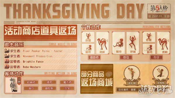 娱乐模式及对应活动奖励也将在感恩节期间限时返场,时装及随身物品返场活动、个性动作返场活动和体验优化更新也将同步开启!