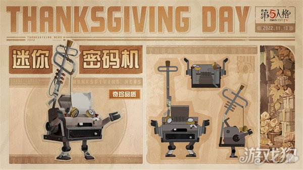 另外,官方还在感恩节之际,设计了一款【奇珍随从】迷你密码机免费赠送给侦探们,希望以此表达对侦探们的感谢!感谢大家对第五人格一直以来的支持和包容!