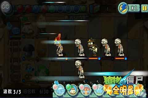 这一关共有三波僵尸,第一波只有两个铁通木乃伊和一个路障木乃伊,战力不是差太多的话可以轻松击破。第二波有六个僵尸,中路手拿火把的探险家僵尸可以远程攻击。能量豆尽量积攒攻击型的,前两波尽量不要释放。